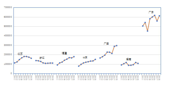 综合2017年至2019年的价格变化,前半年的1~5月是养殖对虾出池价格较高的时间段,最高价出现在4月份,到5月略有下降;6~10月养殖对虾大量上市,是塘口价最低的时间段,具体到地区略有不同。