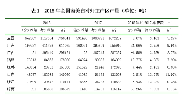 虽然南美白对虾养殖尤其是淡水养殖遍布全国,但因各地自然条件不同,产量分布比较集中:南部沿海地区广东、广西、海南3省区合计约占全国总产量五成半,东南部沿海地区江苏、浙江、福建、山东4省合计约占三成半,其他省份占一成五左右。2018年,全国南美白对虾养殖总产量为1760341吨,比上年增长5.27%。其中海水养殖1117534吨,增长3.40%,淡水养殖642807吨,增长8.67%。总产量排名前5位的省份分别为广东、广西、福建、江苏、山东,5省合计产量139.44万吨,比上年增加了8万吨,占全国比重为79.21%,较上年提高了0.6个百分点。此外,产量超过10万吨的还有浙江和海南,7省合计占全国总产量90%以上。海水养殖产量前5位分别是广东、广西、海南、福建、山东,均超过10万吨,其余省份都低于4万吨。淡水养殖产量前5位分别是广东、江苏、福建、浙江、山东。
