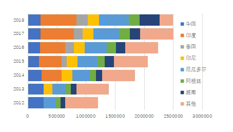 图5. 主要出口国家出口规模变动趋势(单位:吨)
