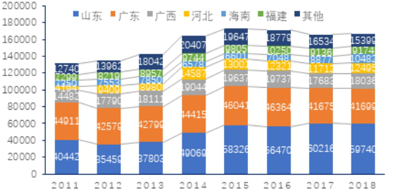 图1. 2011~2018年全国南美白对虾海水养殖面积变化情况(单位:公顷)