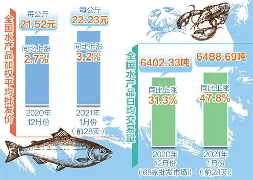 1月份,全国水产品价格环比小幅上涨,成交量继续增加。国家大宗淡水鱼产业技术体系产业经济研究室监测数据显示,1月份(前28天),全国水产品加权平均批发价为每公斤22.23元,环比上涨3.3%,同比上涨3.2%;水产品日均交易量6488.69吨,环比增长1.3%,同比增长47.8%。