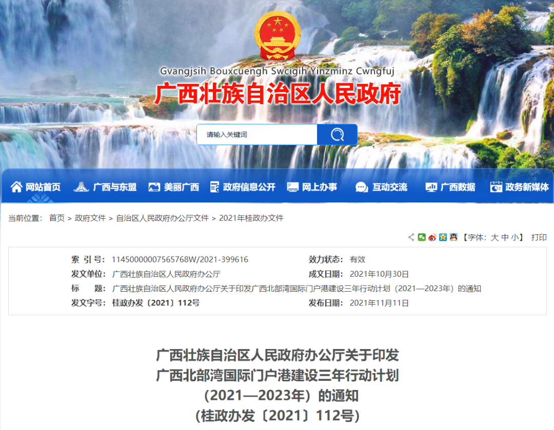 2021年10月30日,广西壮族自治区人民政府办公厅印发的《广西北部湾国际门户港建设三年行动计划(2021—2023年)》的通知中明确提出了“建设大宗物资中转交易中心和冷链物流集散基地”的工作内容,其中涉及到:提升大宗商品服务能力,打造冷链物流集散基地等具体工作部署,以及明确南宁、北海、钦州、防城港等市政府以及对应部门推进相关工作。