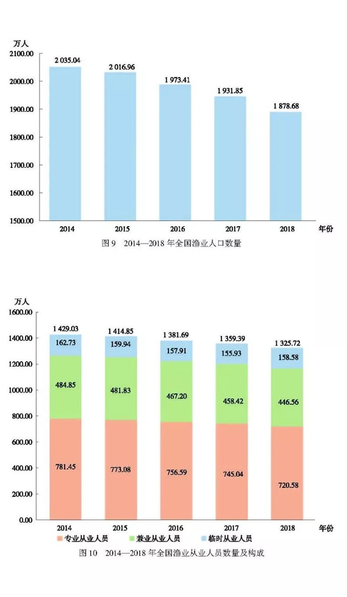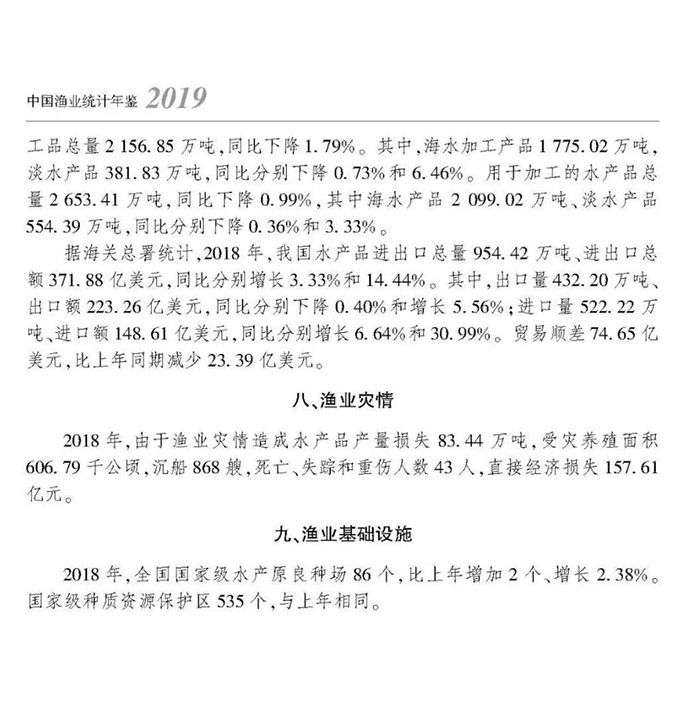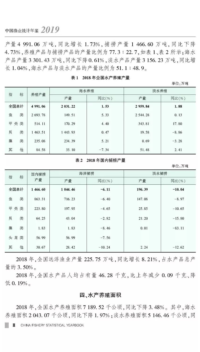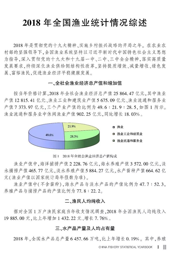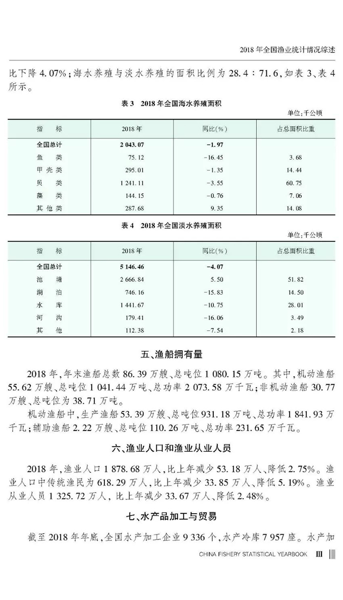 日前,由中国农业出版社出版的《2019中国渔业统计年鉴》发布,该渔业年鉴统计的是过去一年(即2018年)我国的渔业发展情况,包括渔业经济总产值、渔民人均收入、各地水产养殖面积、品种及产量,以及捕捞业方面的数据,包括渔船数量、从业人员数量,水产品加工情况等。